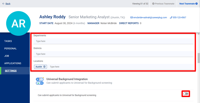6. To give the user access to submit background checks, turn on the Can submit applicants to Universal for Background screening toggle.