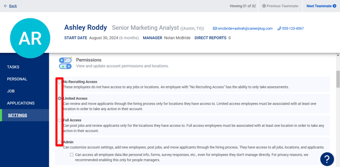 | Limited Access | Can view posted jobs and move applicants through the hiring process only for locations they have access to. Limited Access users must be associated with at least one location in order to take any action in their account and cannot take any job-related actions. |