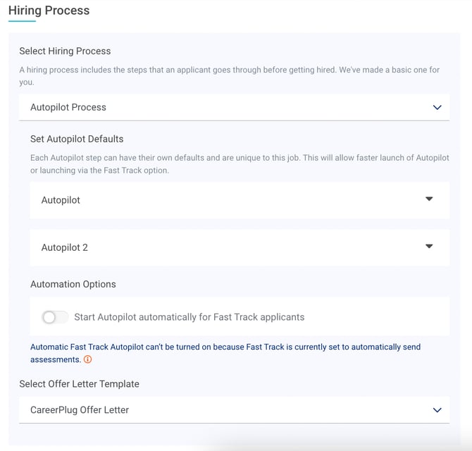 If you have Automatic Fast Track Assessments enabled for your account, then you cannot turn on Autopilot Fast Track for any of your jobs.